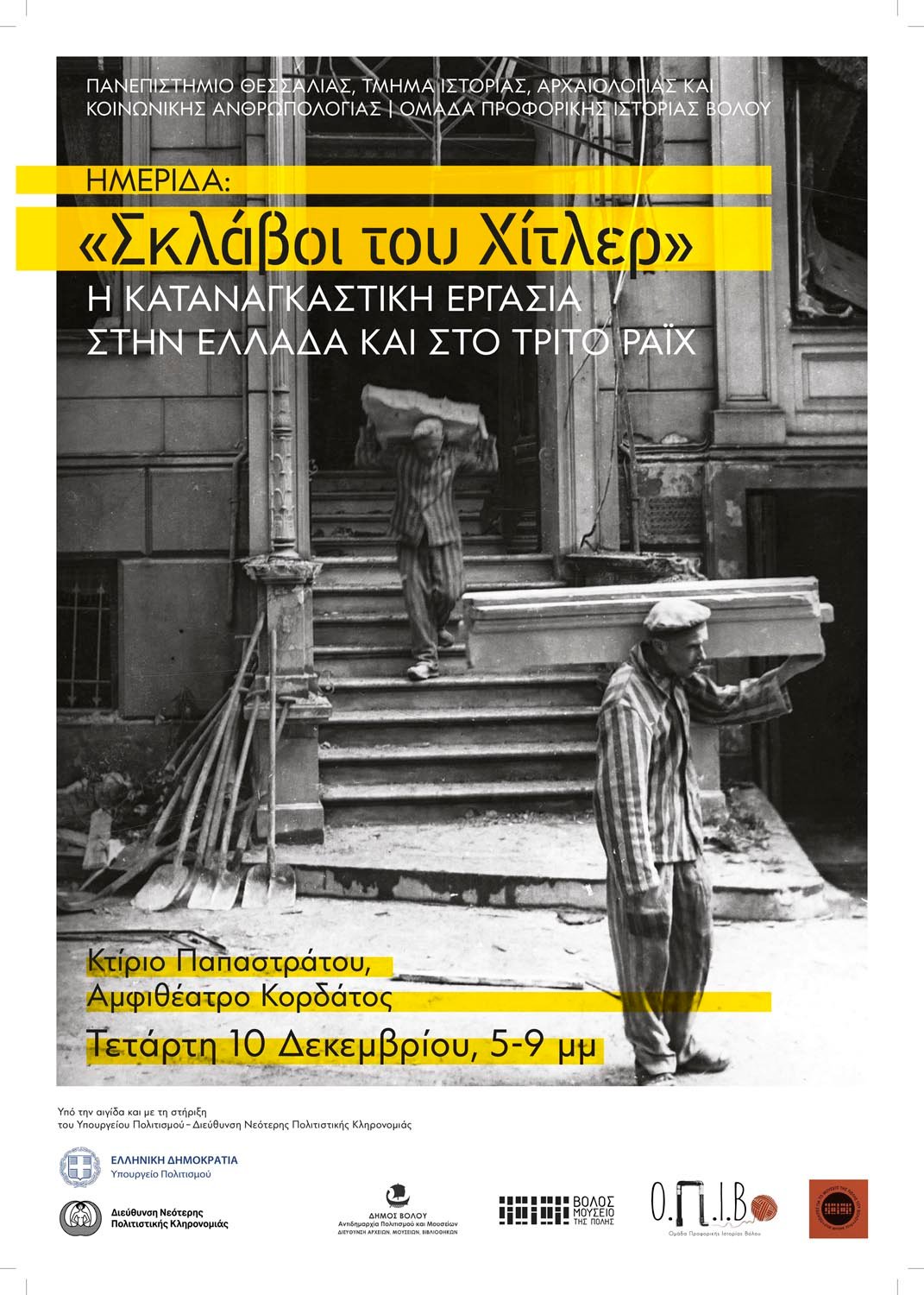 Η φρίκη της καταναγκαστικής εργασίας που επέβαλε το ναζιστικό καθεστώς σε χιλιάδες Έλληνες κατά την περίοδο της Κατοχής αναδεικνύεται σε ειδική ημερίδα με τίτλο «Σκλάβοι του Χίτλερ. Η καταναγκαστική εργασία στην Ελλάδα και στο Τρίτο Ράιχ». Η εκδήλωση θα πραγματοποιηθεί την Τετάρτη 10 Δεκεμβρίου, από τις 5 έως τις 9 μ.μ., στο αμφιθέατρο «Κορδάτος» του Πανεπιστημίου Θεσσαλίας. Τη συνδιοργάνωση έχουν το Τμήμα Ιστορίας, Αρχαιολογίας και Κοινωνικής Ανθρωπολογίας (ΙΑΚΑ) και η Ομάδα Προφορικής Ιστορίας Βόλου (ΟΠΙΒΟ),
